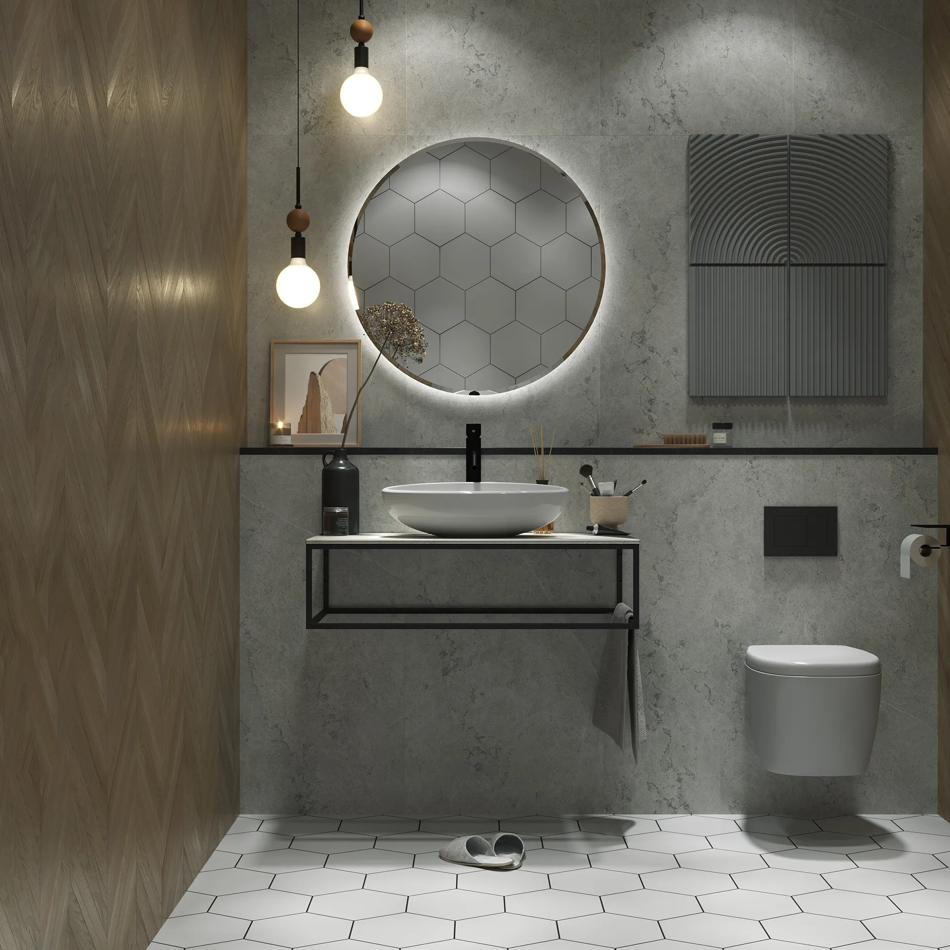 Столешница из керамогранита - это стильное, функциональное и долговечное решение, которое подойдет для ванных комнат, исполненных в самых разнообразных отделочных материалах. Такая универсальность, тем не менее, предполагает высокую декоративную и эстетическую ценность столешницы - она делает обстановку в ванной комнате по-настоящему стильной и соответствующей актуальным тенденциям в дизайне. Металлическое подстолье создает эффектный цветовой контраст, а также может использоваться в качестве практичных рейлингов для удобного размещения полотенец и банных халатов.Характеристики: