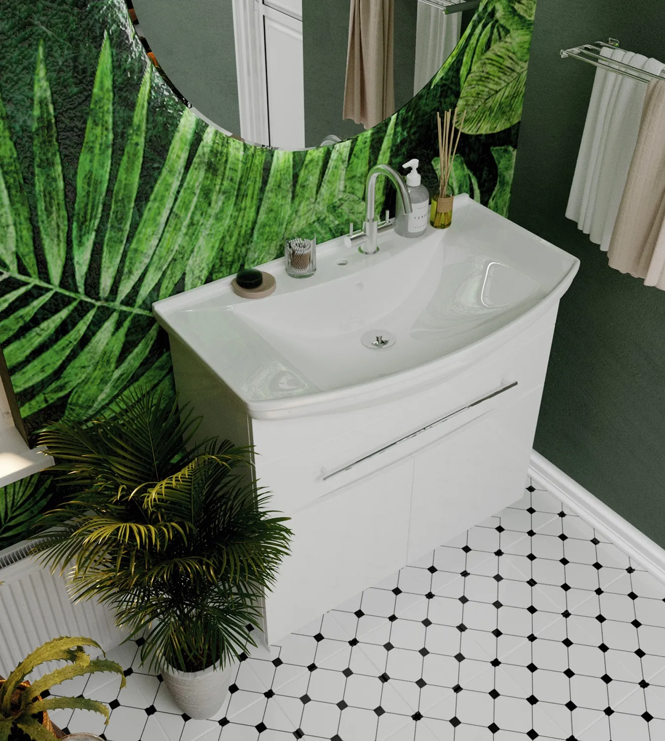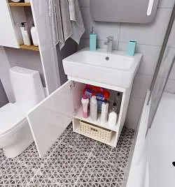 • В тумбе удобно организовать хранение. В открытой полках можно разместить органайзеры, предметы ежедневного пользования и декоративные элементы. А в закрытой – бытовую химию или средства личной гигиены.