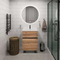 • Материал фасада – МДФ, облицованная матовой пленкой ПВХ, светлый деревянный корпус из влагостойкой ЛДСП. Благодаря этому тумба надолго сохранит первозданный вид в условиях повышенной влажности ванной комнаты.