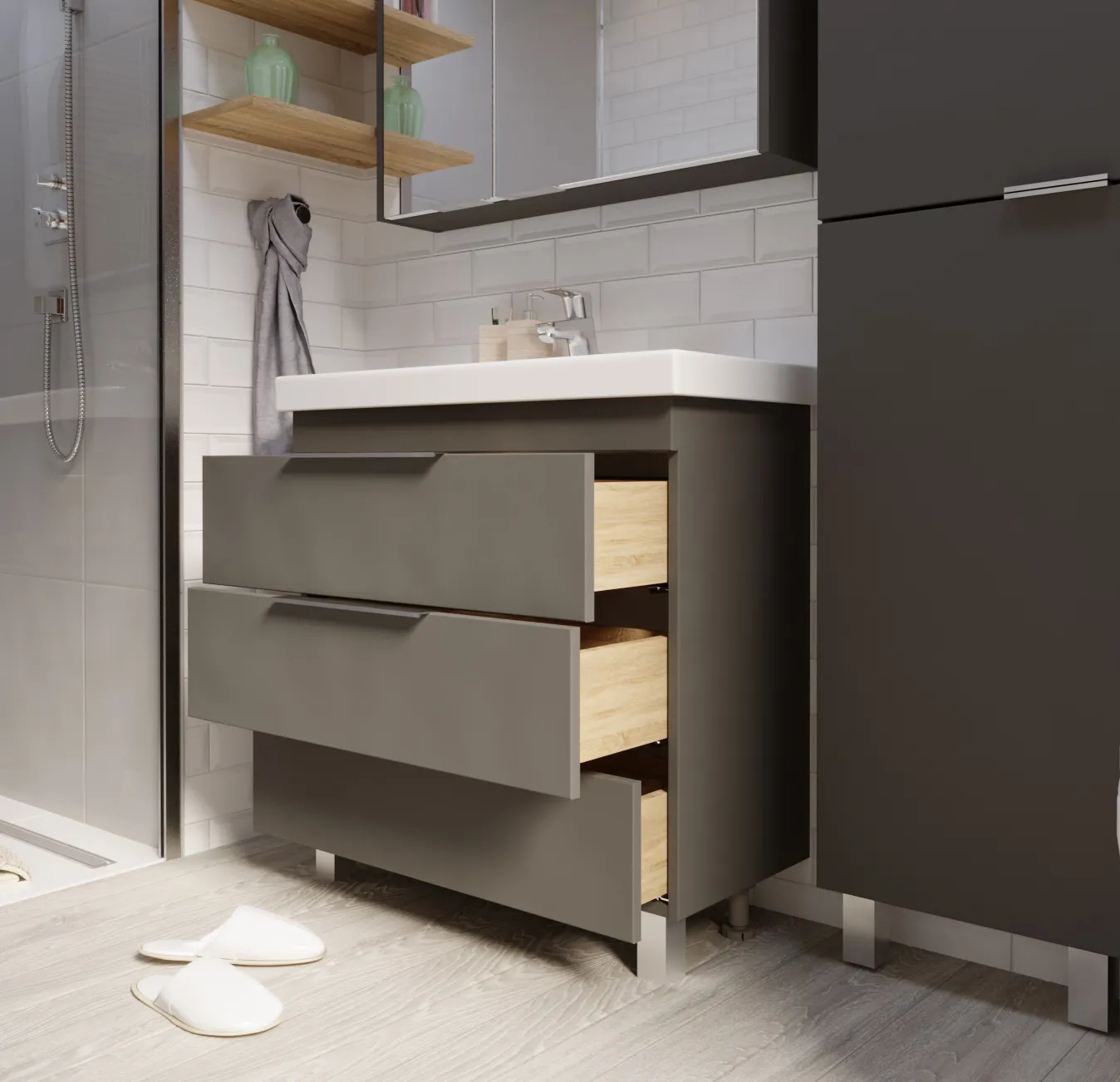 Тумба для современной или эклектичной ванной комнаты с тремя вместительными выдвигающимися ящиками, дополненными оригинальными ручками. Она создана специально для поклонников актуальных решений в дизайне мебели для ванной комнаты, поэтому отличается лаконичным дизайном, отсутствием лишних деталей и бескомпромиссной функциональностью. Ее дополнительное преимущество состоит в благородном сером цвете корпуса. Разделение ящиков на функциональные отсеки делает ежедневное использование тумбы еще более удобным и комфортным.Характеристики: