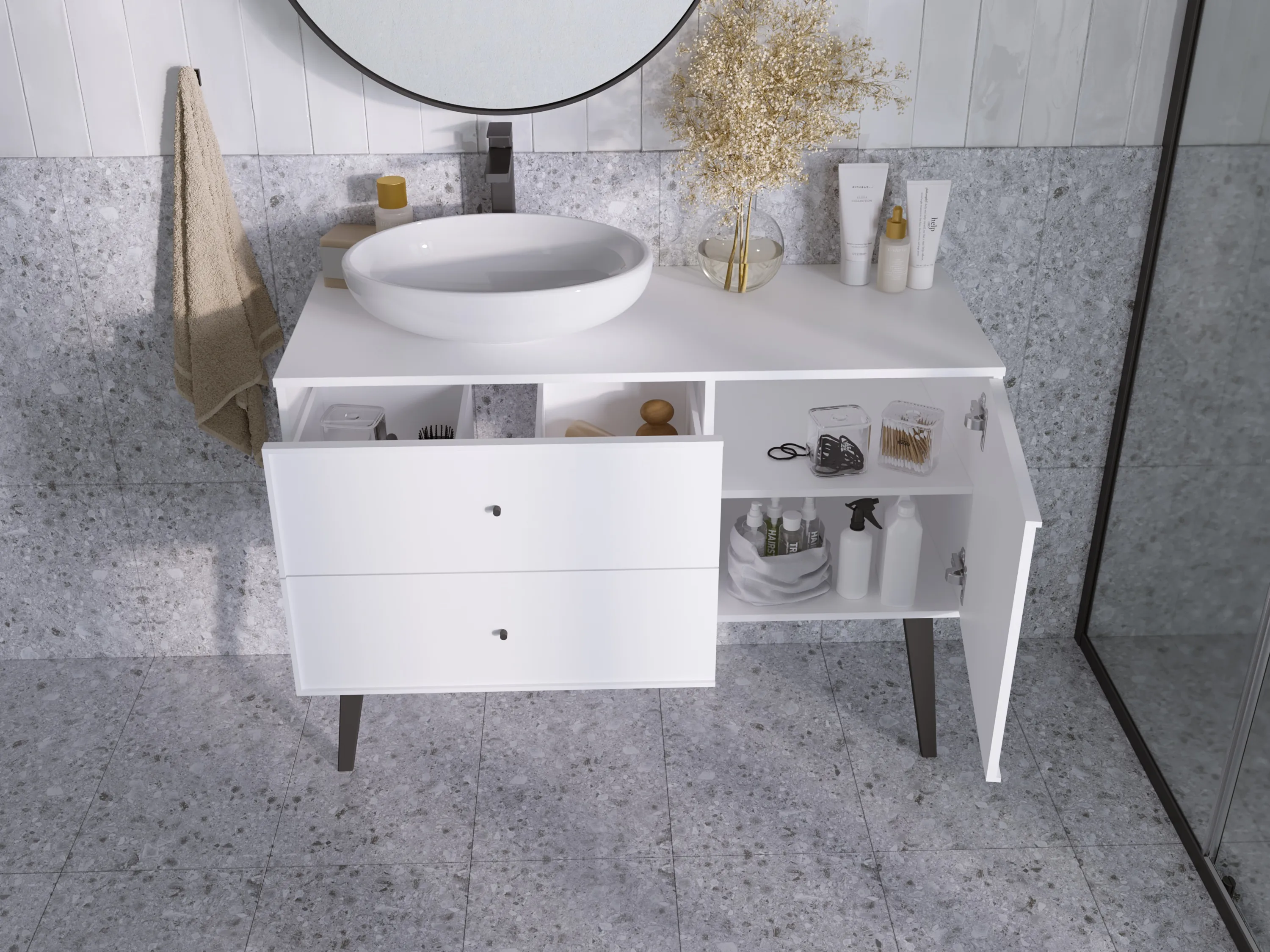 Тумба для современной или эклектичной ванной комнаты с тремя вместительными выдвигающимися ящиками, дополненными оригинальными ручками. Она создана специально для поклонников актуальных решений в дизайне мебели для ванной комнаты, поэтому отличается лаконичным дизайном, отсутствием лишних деталей и бескомпромиссной функциональностью. Ее дополнительное преимущество состоит в благородном сером цвете корпуса. Разделение ящиков на функциональные отсеки делает ежедневное использование тумбы еще более удобным и комфортным.